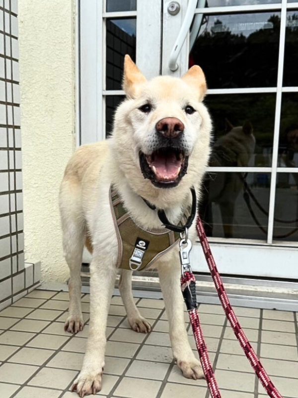 | 性格 | 普段はこわもてに見えるお顔、でもちょっと怖がりな性格の男の子。お散歩がとても大好きで、この時はとびっきりの笑顔になります。 |